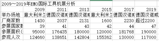 2019年9月16~23日的EMO汉诺威欧洲机床展,共有17个展馆进行展示。并根据主办单位统计2019年EMO汉诺威欧洲机床展的参展厂商家数共计超过2200家,参展的国家数为47个国家,参观人数为117000人,其中自国外参观者的比率较2017年增加。不过此次EMO展参观人数是自2009年以来最少的一届,相较于上一届减少约13000人,显示全球经济景气在迈入增长趋缓的发展趋势,并影响制造业的产能利用率呈现低于80%的水平,导致制造业对于生产设备投资处于审慎评估状态。