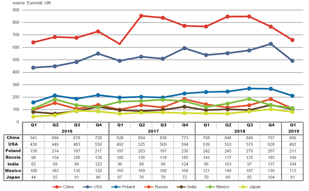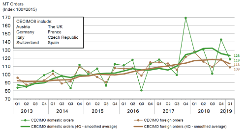 图2 2016Q1~2019Q1欧洲主要机床出口订单分析