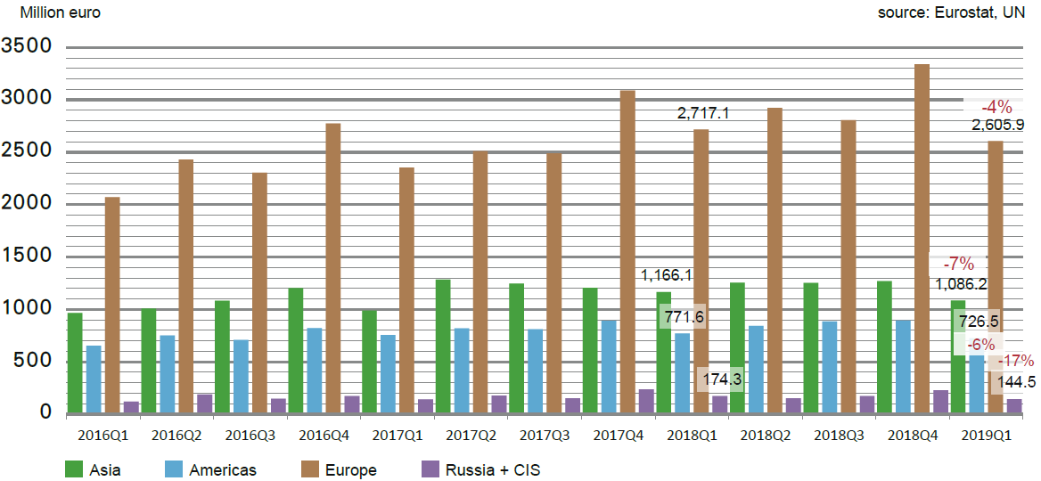 再者,分别针对欧洲主要机床生产国2016年第一季至2019年第一季机床出口金额进行探讨,其中主要生产国包含德国、意大利、瑞士、奥地利、法国、英国、西班牙与捷克于2019年Q1的整体出口金额为45.7亿欧元,相较于2018年Q1下滑5%。其中出口至亚洲、美国、欧洲、俄罗斯的金额分别为10.9亿欧元、7.3亿欧元、26.1亿欧元与1.4亿欧元,相较于2018年同期下滑程度分别为7%、6%、4%与17%。