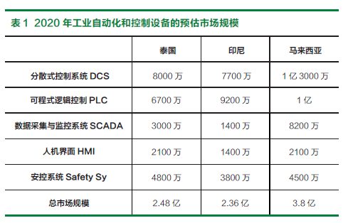 泰国政府积极的提供汽车产业投资优惠政策(如:SuperCluster之8免5减半租税优惠),吸引许多汽车知名品牌制造商在泰国建立制造基地,像是美国通用汽车、福特及日本铃木、丰田、本田,已有“亚洲底特律”美名。随着劳动薪资上涨,高教育水平普及,泰国必然转型成为汽车、摩托车、电子制造业和内需消费的重镇。泰国工业自动化和控制设备的发展伴随着对外投资和吸引外资的步伐,近年来发展迅速,2020年的市场规模预计达到2.48亿美元,其中分布式控制系统(DCS)为8000万美元、可程序逻辑控制器(PLC)为6700万美元、数据采集与监控系统(SCADA)3000万美元、人机接口(HMI)为2100万美元、安控系统(Safety System)为4800万美元。印度尼西亚目前是全球第三大摩托车市场,仅次于中国与印度。以“加速及扩大印度尼西亚经济发展总纲领”为经济发展蓝图,其在摩托车制造、电子产品制造、能源产品,食品加工、造船等产业正加速开放外资投资。印度尼西亚摩托车零部件需求庞大,除摩托车零部件生产需求外,印度尼西亚塑料业生产的家用品及食品、饮料、化妆品、医药所需之塑料包装材料与容器,已有对于自动化生产设备的需求。印度尼西亚2020年工业自动化和控制设备的市场规模预计达到2.36亿美元,其中DCS为7700万美元、PLC为9200万美元、SCADA为1400万美元、HMI为1400万美元、Safety Systems为3800万美元。