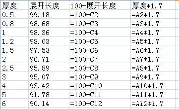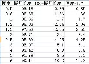 后面的厚度测算我就不一一发图了。测试数据全部真实,总结表格出来后,惊人的发现。所有数据都符合我讲的的折弯扣除等于材料厚度的1.7倍的规律。下面表格就是我测试的数据: