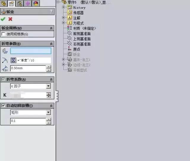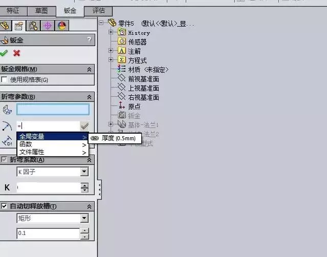 开始设置钣金参数:点选钣金,右键编辑特征,钣金厚度设置为0.5,折弯半径设置有个技巧,要设置为:输入“=”号,全局变量,厚度0.5mm,出现=“厚度”时,在/10,如下图: