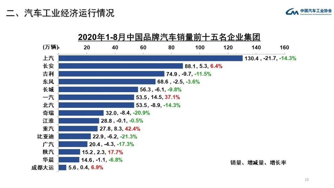 中汽协发布2020年1-8月中国品牌汽车销量前十五企业集团榜单,大部分自主品牌车企在疫情及车市竞争加剧的环境下,销量出现下滑,仅5家实现了同比增长。