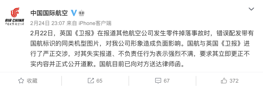 @中国国际航空 在微博发布声明,2月22日,英国《卫报》在报道其他航空公司发生零件掉落事故时,错误配发带有国航标识的同类机型图片,对我公司形象造成负面影响。国航与英国《卫报》进行了严正交涉,对其失实报道、不负责任行为表示强烈不满,要求其立即更正不实内容并正式公开道歉。国航目前已向对方送达律师函。