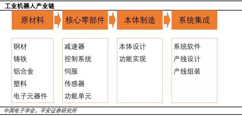 上游是核心零部件,中游是自动化加工设备(工业机器人等),下游是自动化集成(各应用领域);