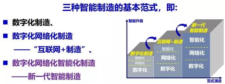 首先,智能制造可以归纳为三种范式:数字化制造、“互联网+制造”、新一代智能制造(数字化、网络化、智能化)。