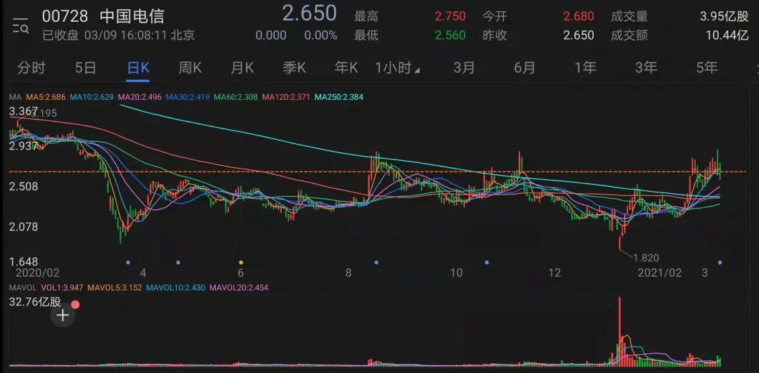 3月9日中国电信港股最新收报2.65港元,总市值2145亿港元。自2020年底纽交所要求三大运营商摘牌以来,运营商股价经历了弱势震荡,但多家券商纷纷看好,并认为股价被低估。例如,华泰证券首次覆盖并于3月2日给予中国电信3.8港元目标价。