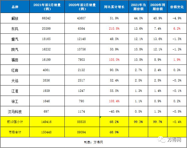 整体来看,2021年2月牵引车前十强的整体市场占比为99.6%,比去年同期的99.9%下降了0.3个百分点。