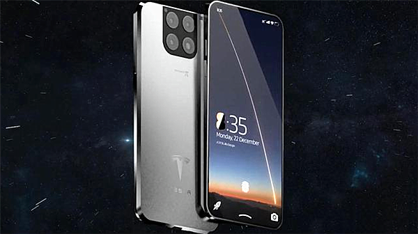 这部手机看起来有点像iPhone 12,侧面又多了些线条的手机,背面印着特斯拉的车标,上面还有型号名称,还配有四颗摄像头,比目前高配版iPhone还多一个。