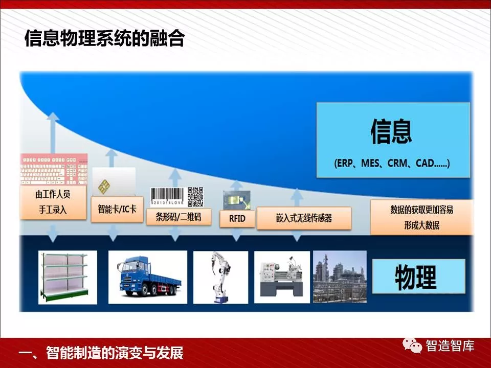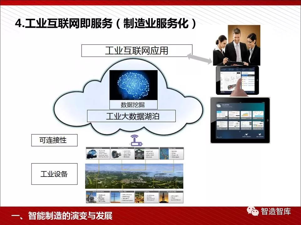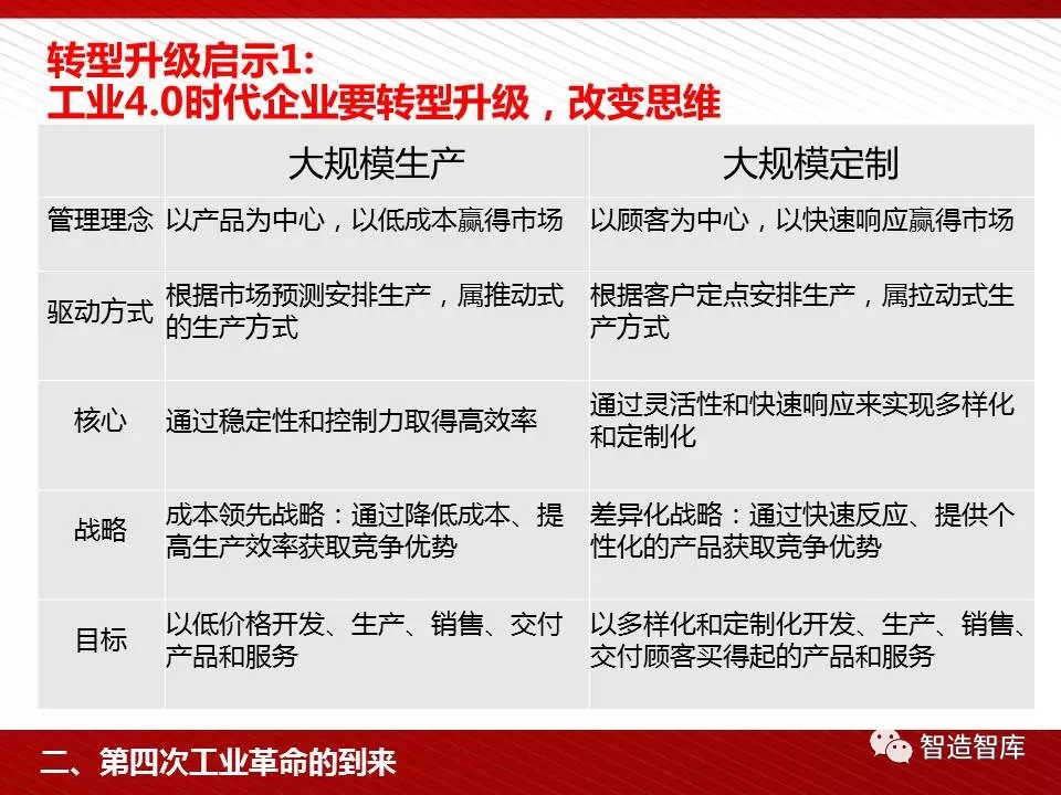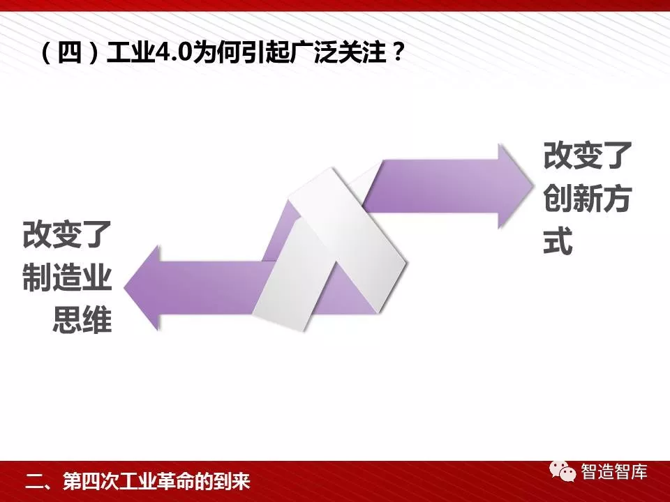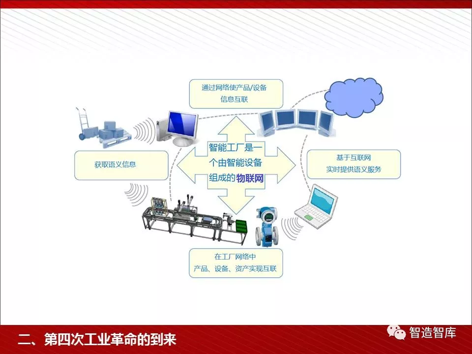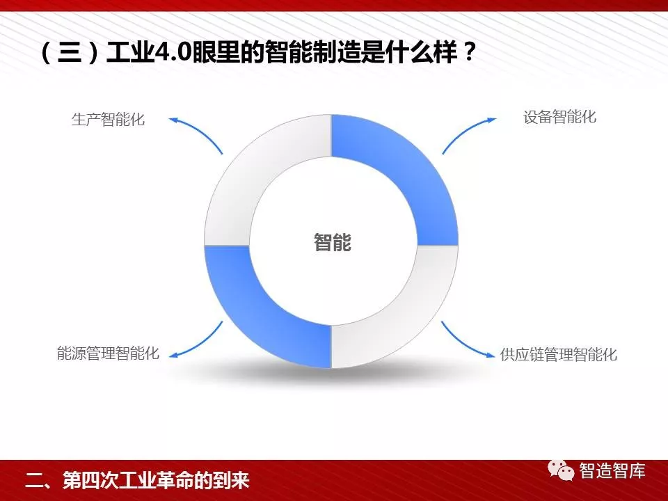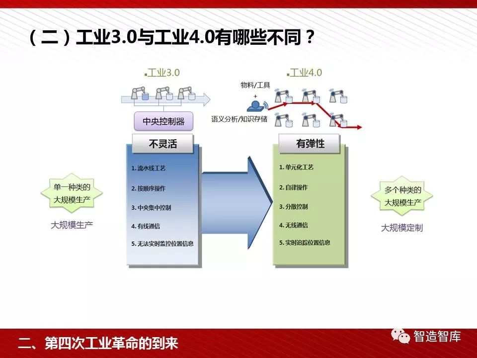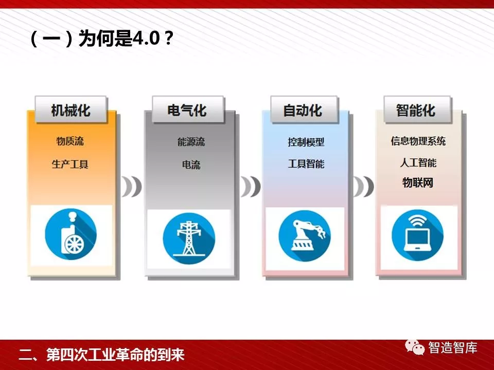 工业4.0在德国被认为是第四次工业革命,主要是指,在“智能工厂”利用“智能设备”将“智能物料”生产成为“智能产品”,整个过程贯穿以“网络协同”,从而提升生产效率,缩短生产周期,降低生产成本。它的典型特征是:融合性与革命性,是新一代信息技术与工业化深度融合的产物,是一种新的生产方式,推动传统大规模批量生产向大规模定制生产转变。