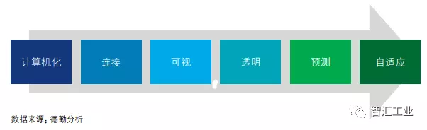 企业数字化能力素质体现在其利用数据指导生产以及系统自优化的能力。我们借鉴国际普遍认可的工业4.0发展路径,将企业智能化成熟度分为六个阶段:计算机化、连接、可视、透明、预测和自适应。