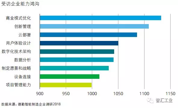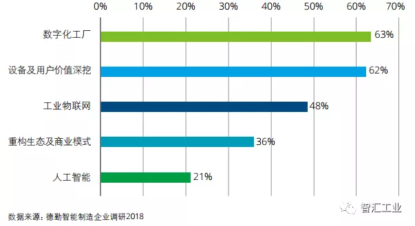 德勤调查发现,中国工业企业智能制造五大部署重点依次为:数字化工厂(63%)、设备及用户价值深挖(62%)、工业物联网(48%)、重构商业模式(36%)以及人工智能(21%)。