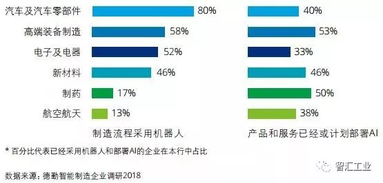 人工智能正迅速渗透各行各业。汽车及汽车零部件制造、高端装备制造、电子及电器制造三个行业在制造流程中采用机器人的比例过半。汽车及零部件制造行业使用机器人的企业比例达到80%,预示未来工业机器人的市场增量将主要来自非汽车行业。在产品和服务领域已 经或计划部署人工智能的行业分布比较均匀,高端装备制造和制药比例较高,但其他行业如新材料、汽车及零部件、航空航天、电子及电器也正在或计划部署人工智能。