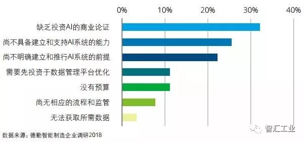 当然人工智能仍处在其发展早期,技术突破及商业论证需要更长时间。另外,人工智能应用环境和基础设施的完善程度,信息和安全法规、企业自身的能力都成为企业面临的主要挑战。我们发现,对于尚未部署人工智能的制造企业来说,缺乏投资人工智能的商业论证、尚不具备建立和支持人工智能的系统能力、尚不明确部署人工智能的前提为主要挑战(见下图)。