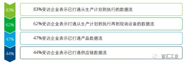 结果显示, 83%的受访企业表示已打通ERP和MES的数据流打通。62%的企业继续向 下打通MES到现场设备的数据流。但仅有47%的企业打通了产品数据流,44%的企业打通供应链数据流。而且考虑到我们调查的企业均为资质较好且为中等以上规模,这一系列比率显然高于中国整体平均水平。