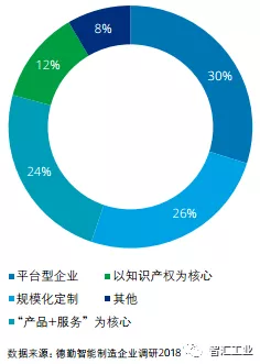 德勤调研发现企业对未来商业模式的规划大致呈四类:30%的受访企业未来商业模式将以平台为核心,26%的企业走规模化定制模式,24%以“产品+服务”为核心向解决方案商转型,12%以知识产权为核心(见下图)。平台型商业模式定位以提供多种软件服务和搭建生态系统为核心,未来可能不会出现类似BAT这样的行业巨头,但不乏垂直行业领军企业或平台。 规模化定制模式,如C2M已经不局限于服装制造,而延伸到汽车和装备制造等行业。“产品+服务”为核心旨在围绕客户需求提供解决方案,是目前很多企业在做的。以知识产权为核心的企业往往通过专利战略,形成技术壁垒占领市场。