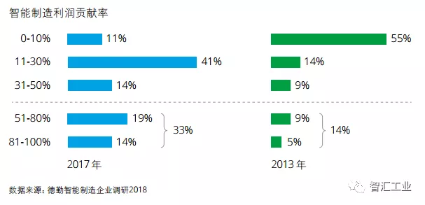 2013年智能制造为企业带来的利润并不明显,55%的受访企业其智能制造产品和服务净利润贡献率处于0-10%的区间,而2017年,仅有11%的受访企业处于这个区间,而41%的企业其智能制造利润贡献率在11-30%之间。利润贡献率超过50%的企业,由2013年受访企业占比14%提升到2017年的33%。智能制造利润贡献率明显提升,利润来源包括生产过程中效率的提升和产品服务价值的提升。
