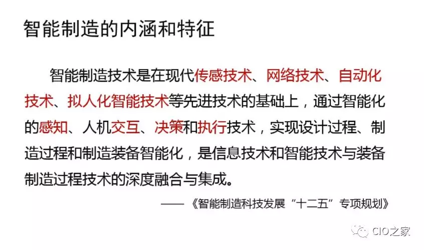 智能制造是工业4.0的重要组成部分,本质上是基于数据(信息、知识、模型)驱动的C2B制造模式,涉及用户需求、产品研发、工艺设计、智能生成、产品服务。“智能”体现在两个层面:一是面对C端个性化的、复杂的、不稳定、变化的需求如何去合理的根据B端已有的资源(组织、能力、原料、设备、库存、供应链),快速的适配出解决方案,完成高品质的产品。二是基于工厂内部人、设备、物料之间的信息互联、感知、优化、控制、执行。