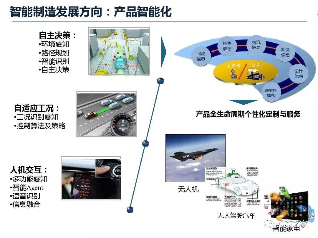 智能化可分为两个阶段,当前阶段是面向定制化设计,支持多品种小批量生产模式,通过使用智能化的生产管理系统与智能装备,实现产品全生命周期的智能管理,未来愿景则是实现状态自感知、实时分析、自主决策、自我配置、精准执行的自组织生产。这就要求首先实现生产数据的透明化管理,各个制造环节产生的数据能够被实时监测和分析,从而做出智能决策,并且智能化系统要能接受企业最高领导层的决策(BI),及有突发情况要能接受人工干预;其次要求生产线具有高度的柔性,能够进行模块化组合,以满足生产不同产品的需求。此外,还应提升产品本身的智能化,如提供友好的人机交互、语言识别、数据分析等智能功能,并且生产过程中的每个产品和零部件是可标识、可跟踪的,甚至产品了解自己被制造的细节以及将被如何使用。