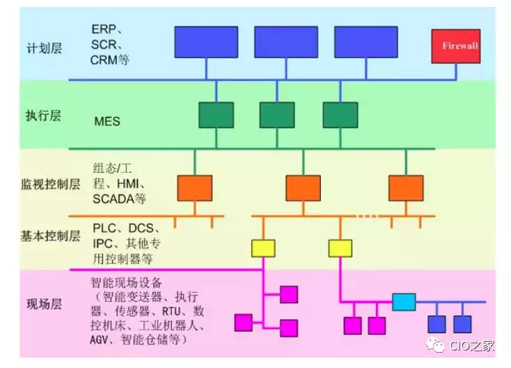 智能工厂/数字化车间互联网络各层次定义的功能以及各种系统、设备在不同层次上的分配如下。