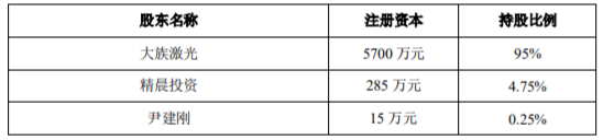 本次增资中,大族激光以自有资金出资人民币3700万元,公司副总经理尹建刚先生出资人民币15万元,大族光伏核心管理团队持股平台深圳市精晨投资企业(有限合伙)出资人民币285万元。增资后股权结构如下: