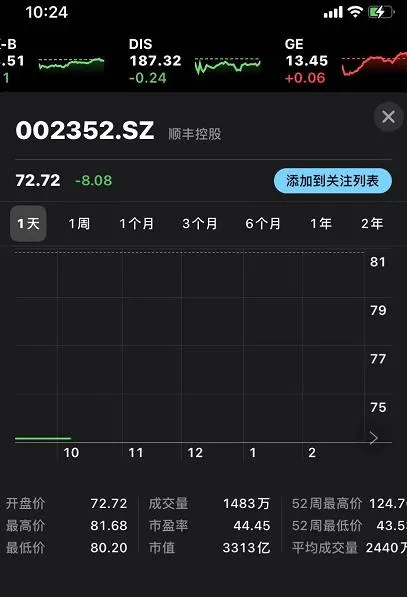 今日(4月9日)顺丰控股开盘一字跌停,开盘价72.72元,市值报3313亿元。今年2月18日顺丰控股盘中股价创下历史新高的每股124.70元,较高点相比,顺丰控股已经缩水超40%,总市值蒸发超2000亿元。实控人王卫持有顺丰大约60%的股份,身价缩水超1000亿。
