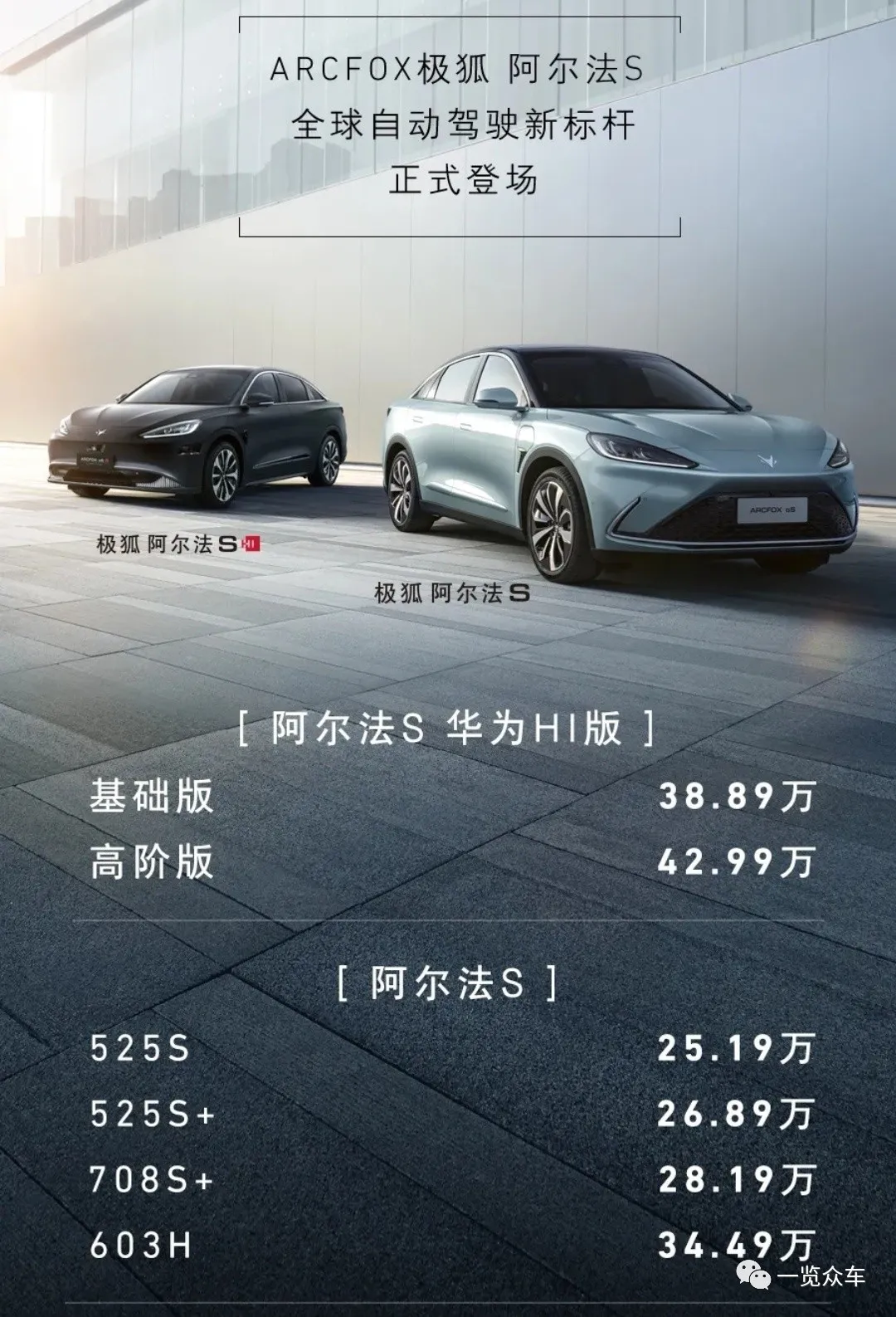 4月17日,ARCFOX极狐与华为共同打造的极狐阿尔法S正式上市,官方指导价25.19万~34.49万元,共推出4款车型。此外,搭载华为智能驾驶功能的极狐阿尔法S华为HI版车型开启预售,预售价区间为38.89万~42.99万元,共推出2款车型。