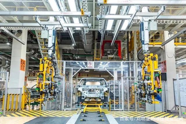 总装车间设计生产能力为60JPH,达产后完成30万的年生产量。它是目前大众汽车集团自动化率最高的量产车型总装车间,自动化率达26.2%,模块化程度和柔性更高。车间二层平台有完备的输送线,车身通过连廊从油漆车间输送至总装车间;电池包则通过输送链到达总装车间二层平台,通过升降机下至底盘预装线。
