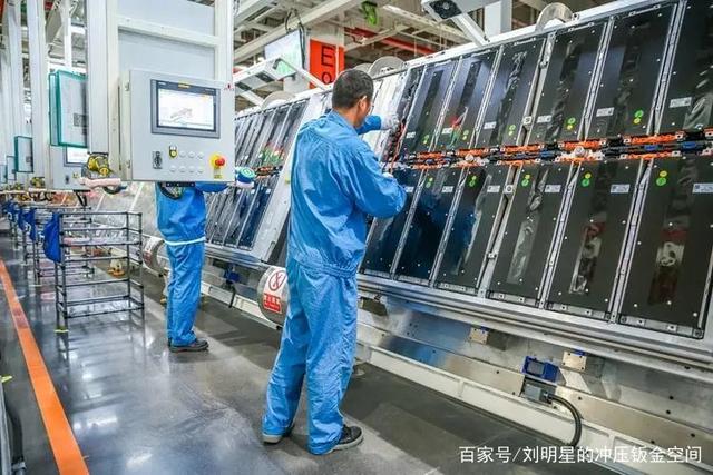 电池车间是上汽大众首个全铝电池壳体自制与电池包装配车间,规划年产能30万台。车间有两层的厂房。二楼是电池壳体线。壳体成品通过升降机自动输送到一楼的电池装配线。电池包完成装配后,通过升降机自动输送到二楼的电池包调序中心,每个电池包与车壳匹配后,通过连廊自动输送到总装车间。