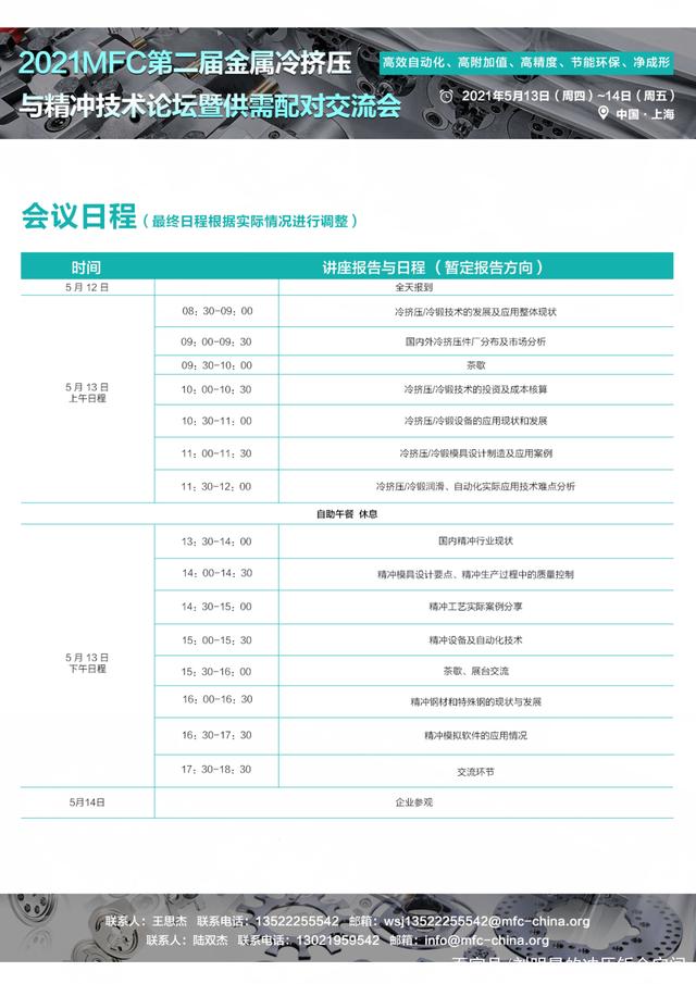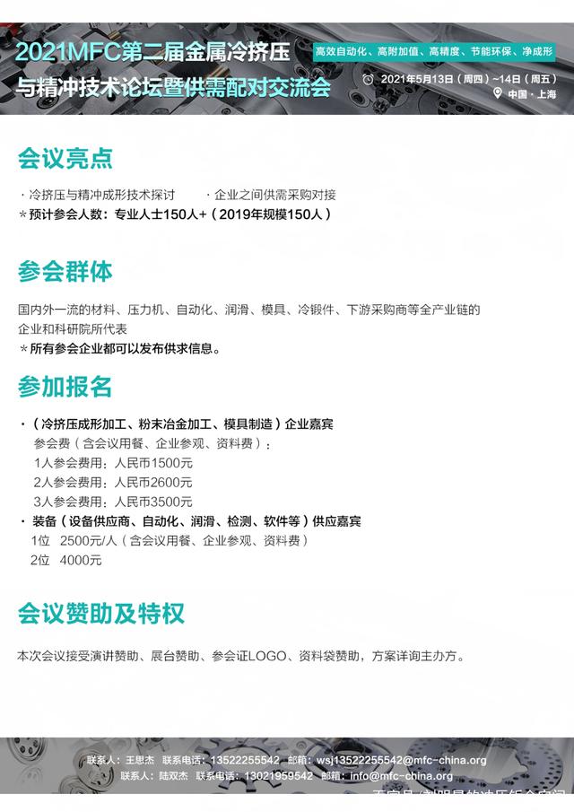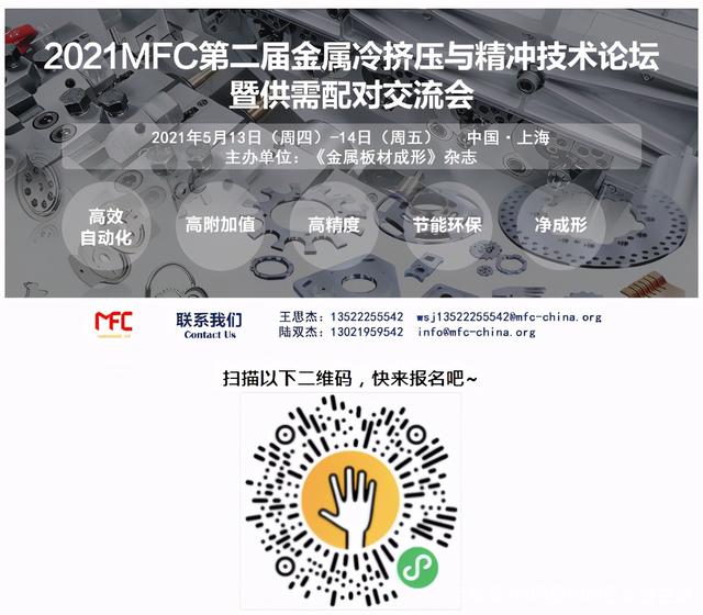 MFC 第二届金属冷挤压与精冲技术论坛将于 2021 年 5 月 13 日-14 日在上海举办,规模大约 150 人。