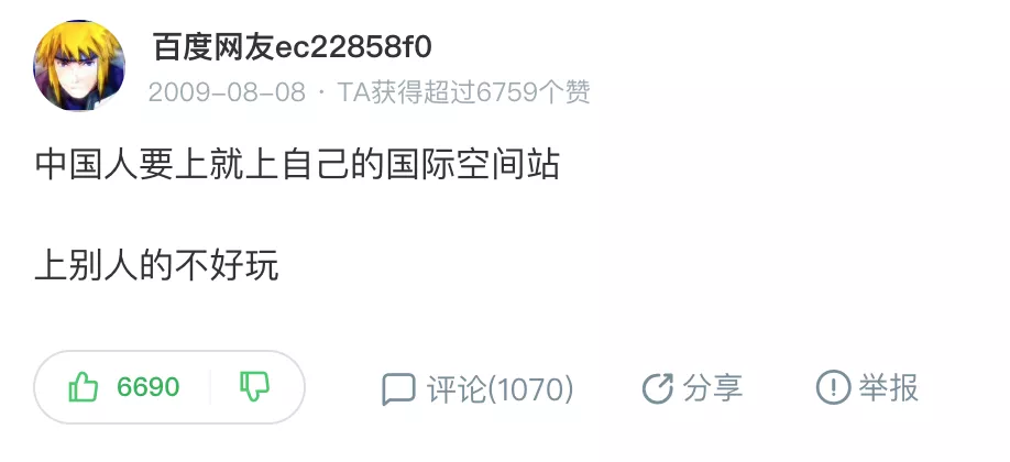 有名网友回答:“中国人要上就上自己的国际空间站,上别人的不好玩。”