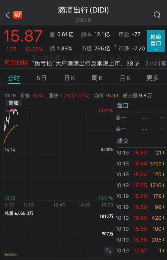 上市首日,滴滴股价高开27%,市值一度突破800亿美元,合人民币超过5000亿元;但随后股价回落,收盘涨幅收窄至1%。