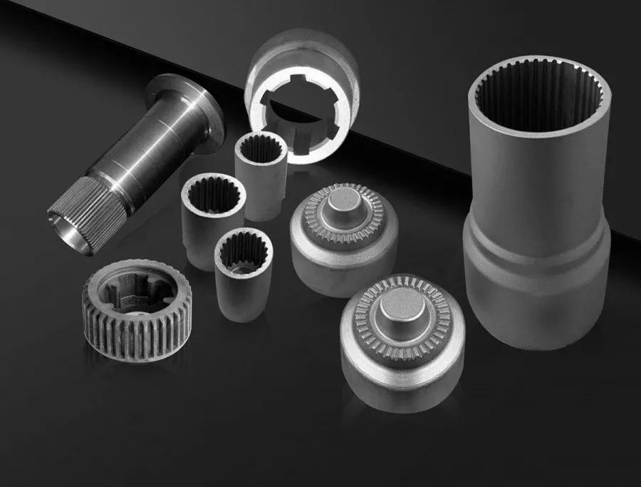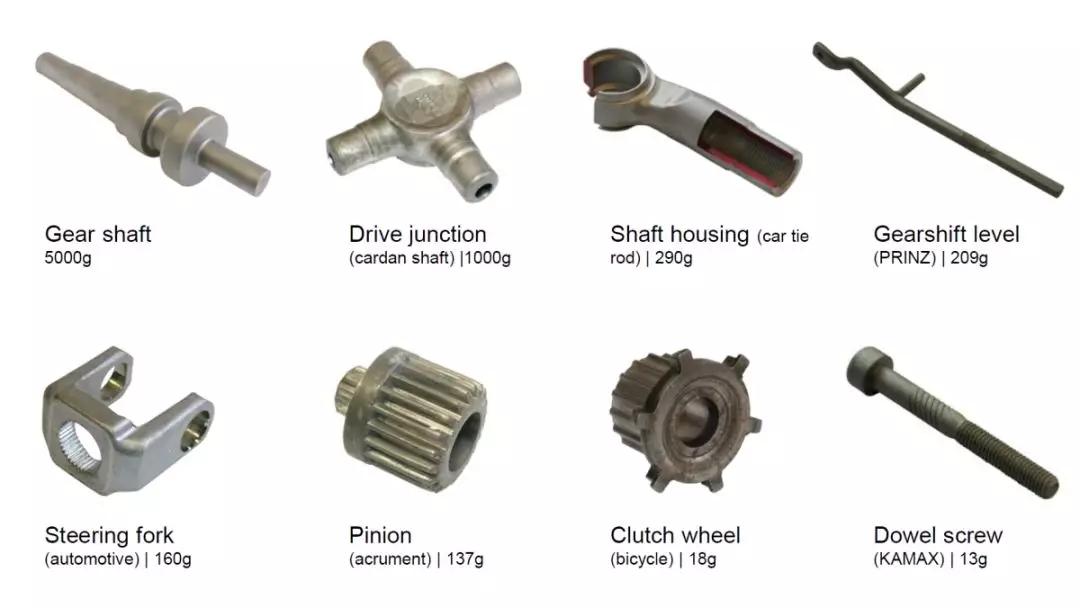 冷锻的变形量有限,所以锻件的重量集中到一般是几克到5KG之间,只要批量足够大,产品附加值足够高,企业就有动力把热锻工艺改成冷温锻来实现。冷锻可以生产发动机各类油泵、汽车传动系统、变速箱系统、制动系统、流体液压系统、工程机械以及电机电器里面用到的各类对称居多的精锻件。国外已较普遍采用冷精锻工艺生产低碳钢、中碳钢和合金钢零件,冷精锻件的形状也多种多样,如齿轮、齿条、同步齿圈、花键轴等。中国的冷锻因为后发优势,在有些复杂的典型传统热成形的花键轴类零件,直接就用冷温锻工艺设计制造。