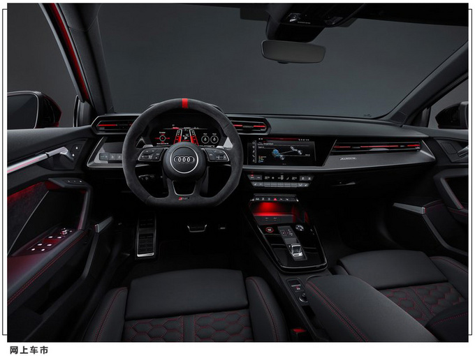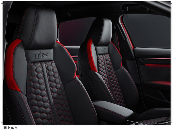内饰方面,新车车内进行了熏黑式设计,并采用红色饰条进行装饰,座椅头部上还配有RS标识。同时新车还配备了12.3英寸的全液晶仪表盘、10.1英寸的中控屏以及Alcantara材质包裹三幅式平底方向盘,方向盘上配备有奥迪大尺寸LOGO和RS标识。总体来说,新车的内饰极具运动感且具有极高的辨识度。