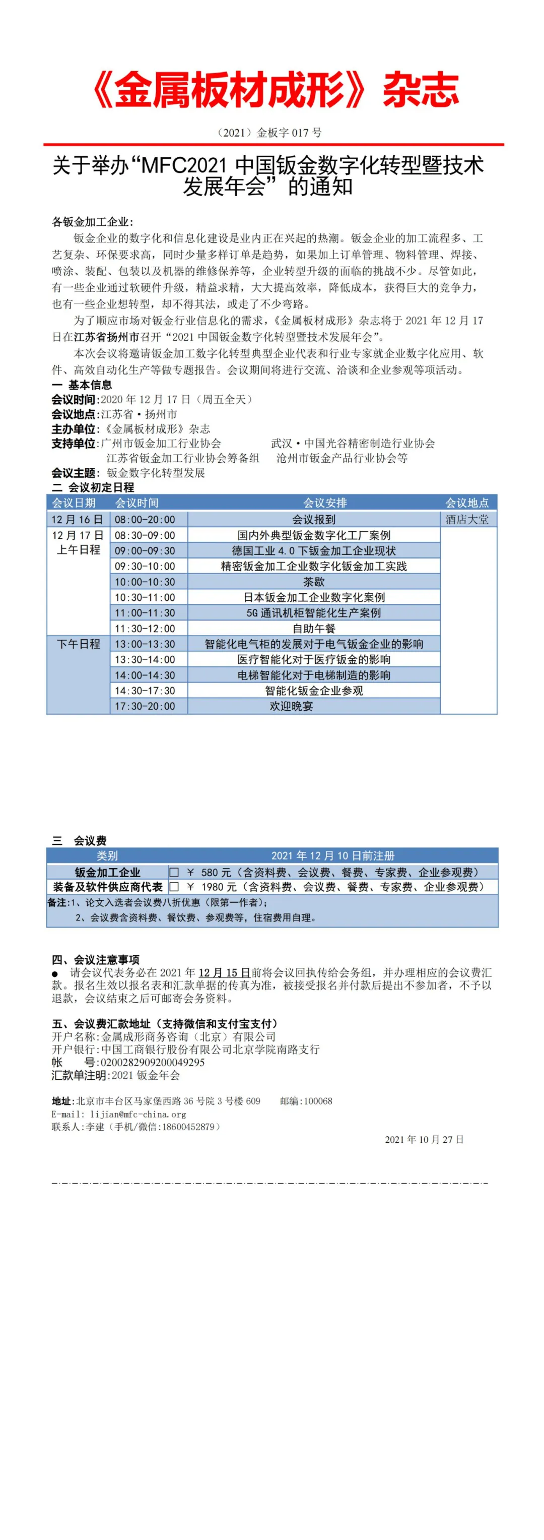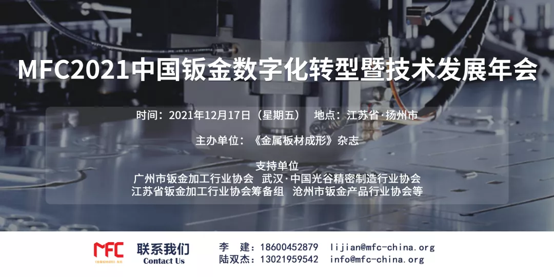 为了顺应市场对钣金行业信息化的需求,《金属板材成形》杂志将于2021年12月17 日在江苏省扬州市召开“2021中国钣金数字化转型暨技术发展年会”。