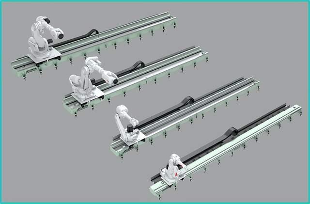 机器人行走轴又称机器人第七轴,机器人轨道等,用于扩大机器人作业半径,扩展机器人使用范围功能,主要应用于焊接、铸造、机械加工、智能仓储、汽车、航天等行业领域。不管是焊接,喷涂,物流搬运等工艺上均有广泛应用。