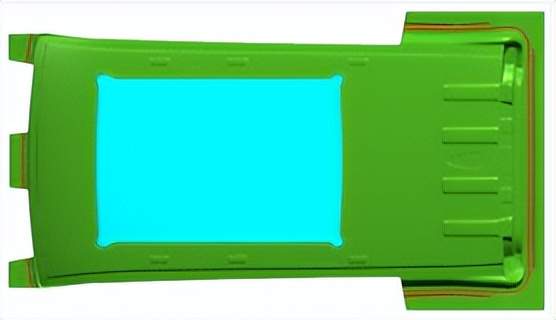 常规覆盖件拉延成型是通过零件四周设置工艺补充以及压边力使材料成型,达到塑性变形。而对于个别零件的局部部位,拉延成型时,可不施加压边力,通过较小的工艺补充使该区域材料自由成型,此方法可减少工艺补充面以及压边圈区域材料,提高材料利用,我们称此种拉延工艺为开口拉延。通过利用开口拉延工艺,我司某车型发动机罩内板材料利用率由51.3%提升到54.9%,板料重量减少约0.64KG。如图7,为开口拉延示意图,图8,为封闭拉延示意图,材料尺寸有明显的减小。开口拉延工艺也可用于梁类零件。