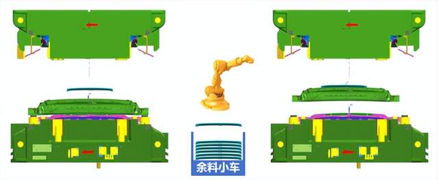材料回收再利用是指大型零件在落料工序或在修边工序将冲压产生的废料收集起来,再用于其他小型零件的冲压。一般在落料工序比较常见的材料回收案例是侧围外板,通常在落料线将前、后门洞部位材料落料后进行收集,为其他小型零件提供板料;在修边工序废料收集方面,通过探索,在大天窗顶盖零件上实现了废料回收(如图4),生产出顶盖加强板零件(如图5)。使顶盖的材料利用率有了大幅度地提升。同时在自动化方面有了创新性的突破。一是在机械手搬运方面,创新地采用了先抓取材料,投料工序件后,再进行材料回收(如图6)。二是在废料回收方面,后续冲压线体均设置了废料回收小车,使得材料回收可延续到后续车型。