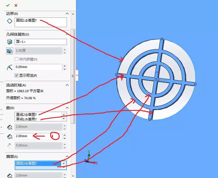 设置参数,按照箭头选择边界,筋,翼梁