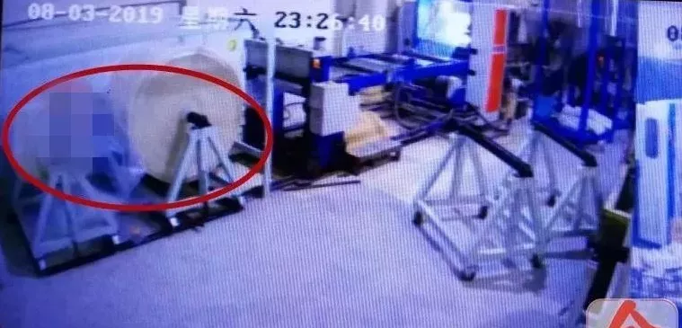 监控左侧卷筒机上,可隐约看到出事男工的脚
