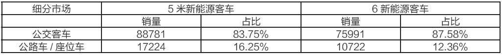 从新能源客车的细分需求领域看,新能源客车的应用需求以公交客车为主。2017年5米新能源客车的需求量为88781辆,如图5所示,占总销量的83.75%,其余公路车销量占比仅为16.25%。就6米以上新能源客车的车型销售情况来看,也以公交车为主,销量占比为87.58%,如图6所示,而另外的座位车销量为10722辆,占当年该标准新能源客车的12.36%。