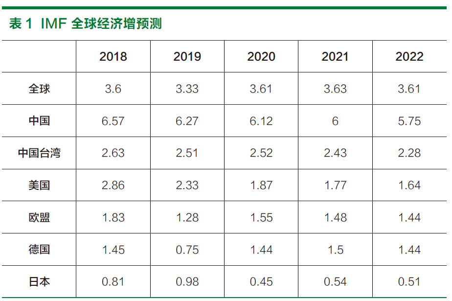 由于美国、中国两大经济体之间的贸易摩擦,持续以提高关税做为贸易战的手段,虽然双方都提出其他经济政策做为补偿,但负面的影响仍是难以被平息,甚至让全球贸易增涨趋势消退。受到美国与中国两大主要经济体影响,亚洲经济受到不小的冲击,整体表现虽较其他区域稳定,但在国际变量增加的情况下,经济走势不确定性增加。欧盟部 分在欧洲银行将停止量化宽松政策、英 国脱欧、法国黄背心抗争运动、奥地利 与意大利民粹再起等,灰犀牛事件频频 出现的状态,都让各经济研究调查机构 纷纷针对 2019 年全球经济增长预估值 进行修正,如 IMF 先前预测全球经济增长率从 3.5% 下修至 3.3%,是 2010 年以来经济增长预测的最低数值。