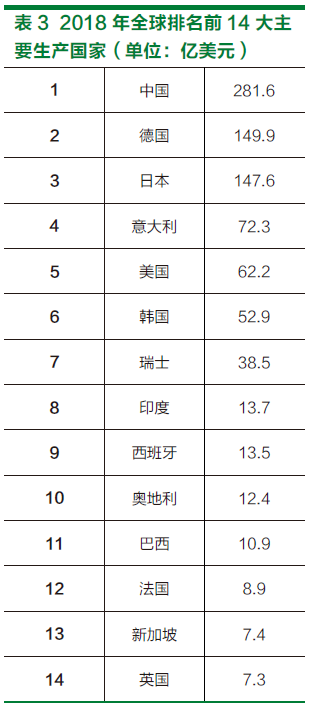 2018年全球机床总产值的增长幅度与全球机床消费总额呈同步增涨, 2018 年全球机床产值约 946 亿美元,相较 2017 年机床产值同样增加 41 亿 美元,涨幅近 4.6%。机床主要生产国 家依序分别为中国、德国、日本、意大 利、美国、韩国、瑞士、印度、西班牙等, 如表 3 所示。